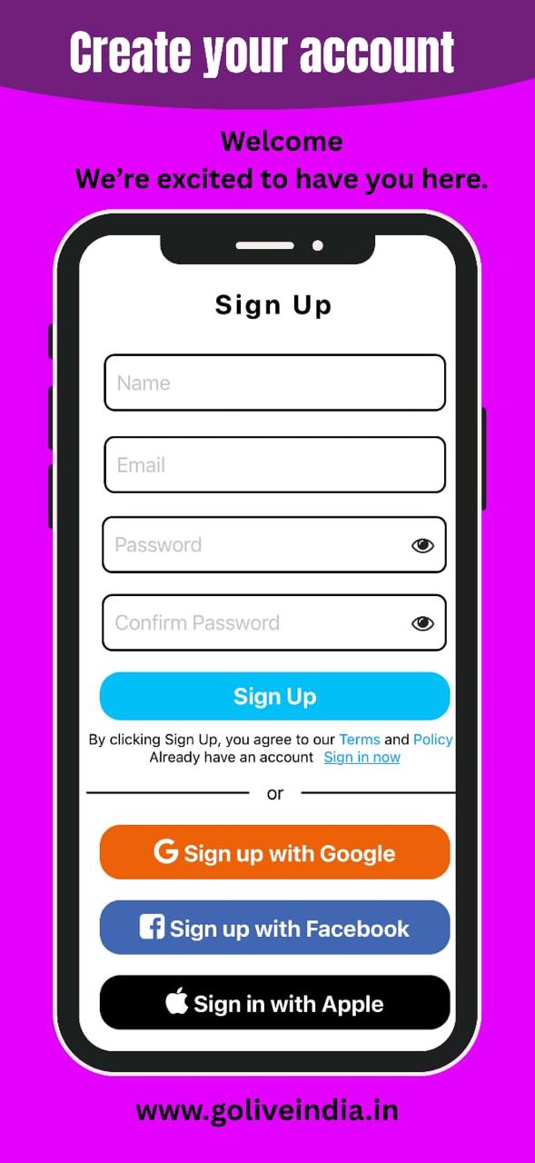 GoLiveIndia makes live streaming simple and accessible for everyone—whether you're a content creator, business owner, educator, or event organizer. While GoLiveIndia offers sign-in options like Google, Facebook, and Apple, you can also create an account using your email address for complete control and flexibility.