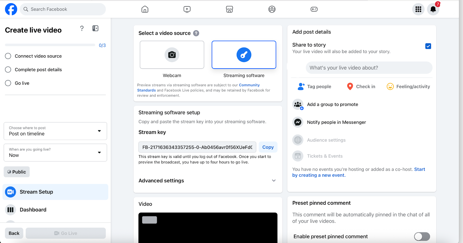 Once you’ve copied your Stream URL and Key from Facebook:
