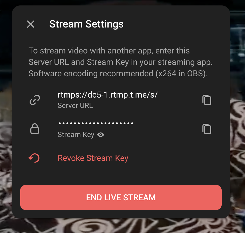 Telegram will provide a Server URL and Stream Key