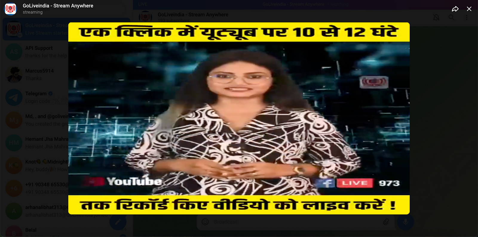 GoLiveIndia supports multistreaming, so you can broadcast to Facebook, YouTube, and more while streaming on Telegram.