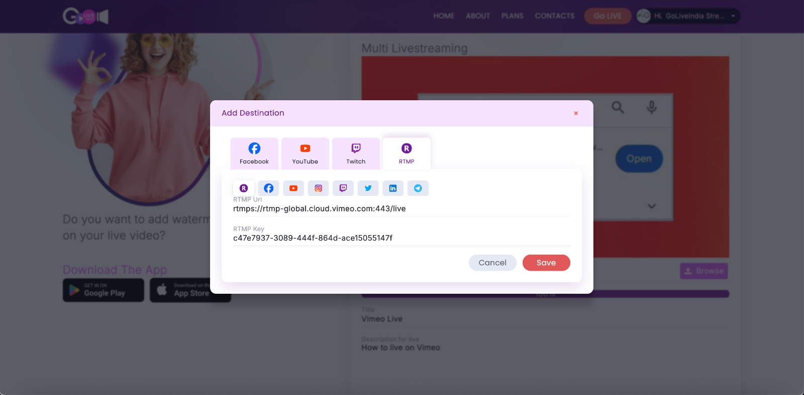 You can stream to any RTMP-compatible destination, including Vimeo, by simply pasting your RTMP URL and Stream Key inside the GoLiveIndia app.