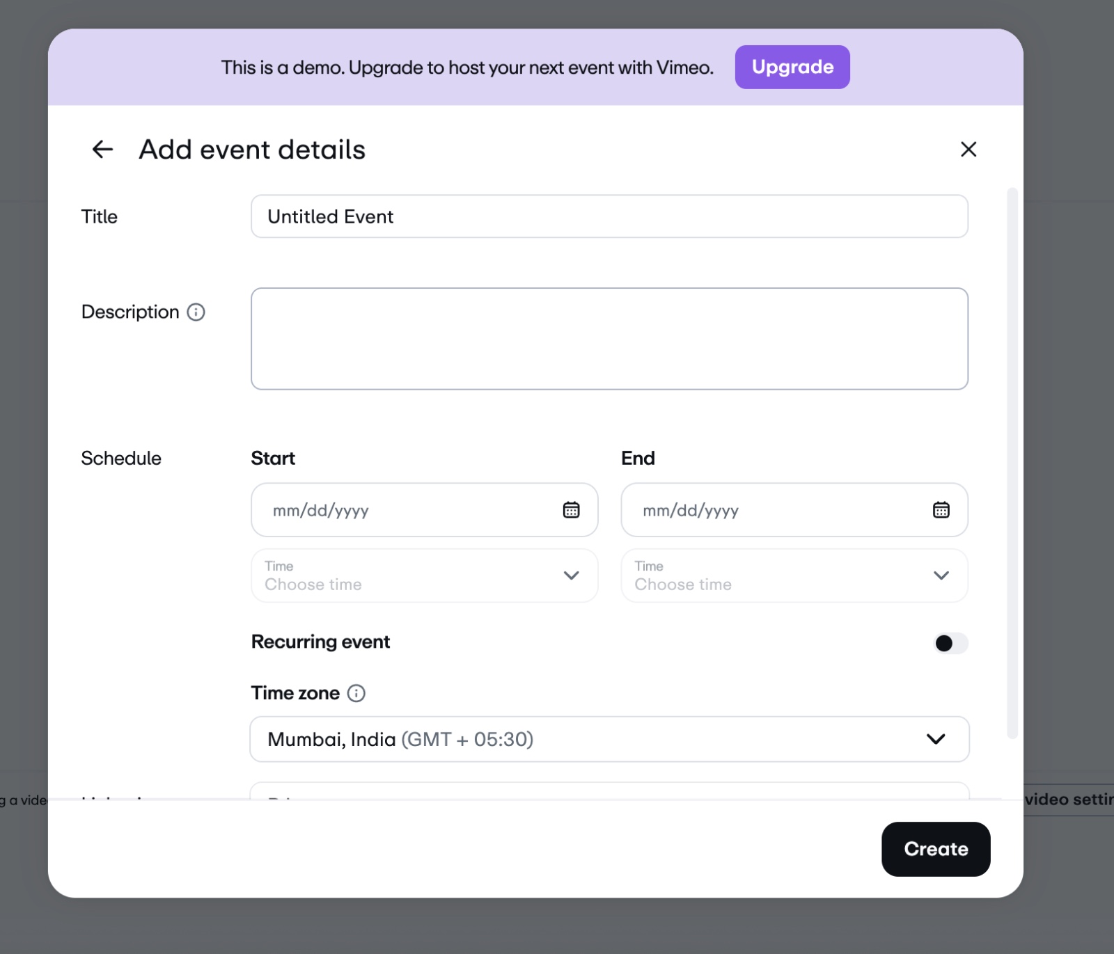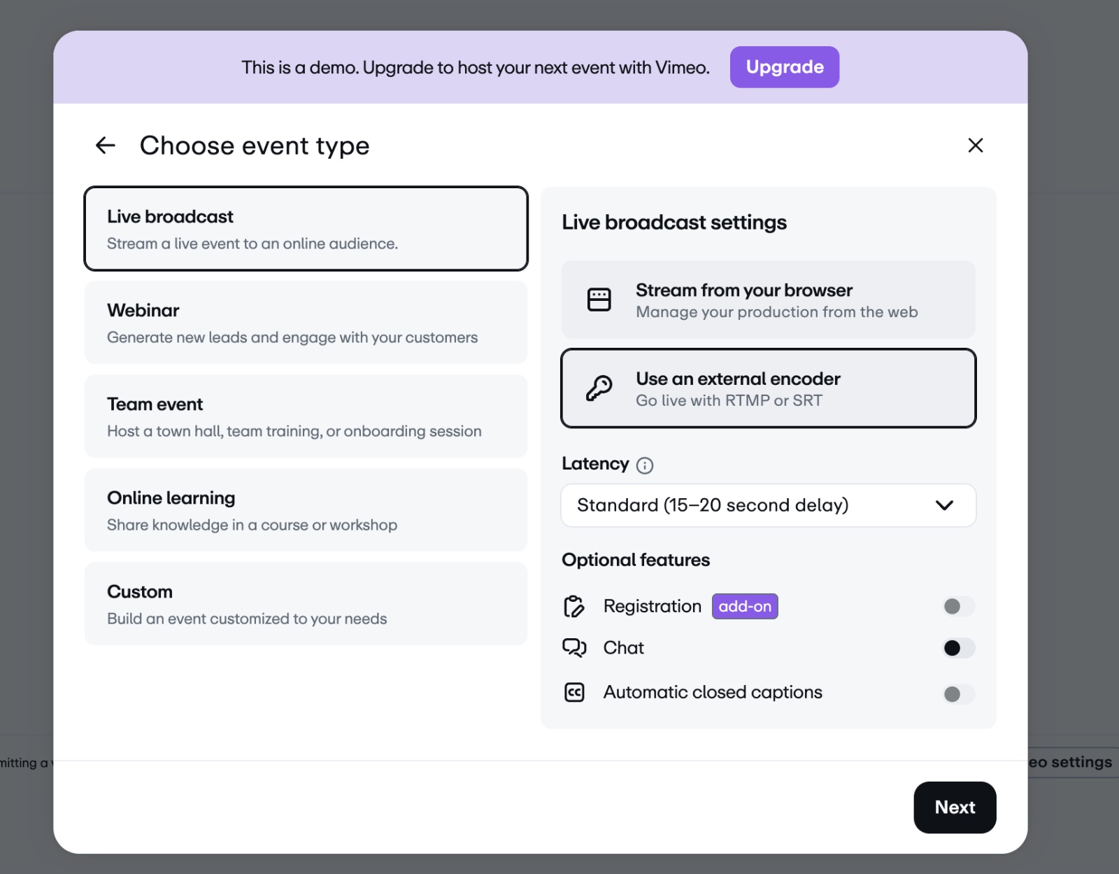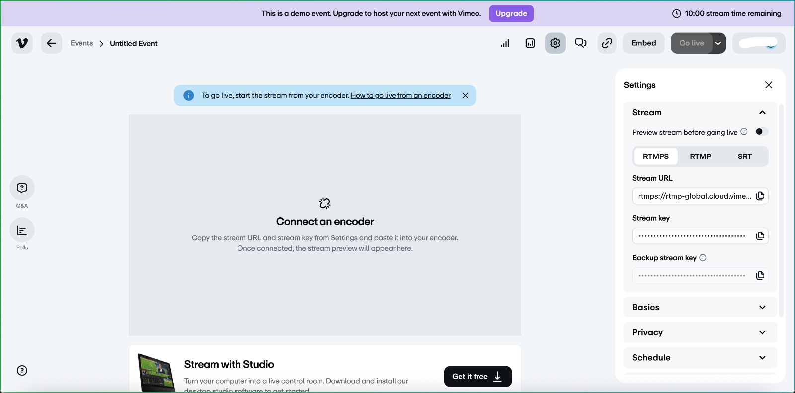 Tip: Vimeo requires a paid plan to unlock live streaming features. Learn more at Vimeo Live Pricing.