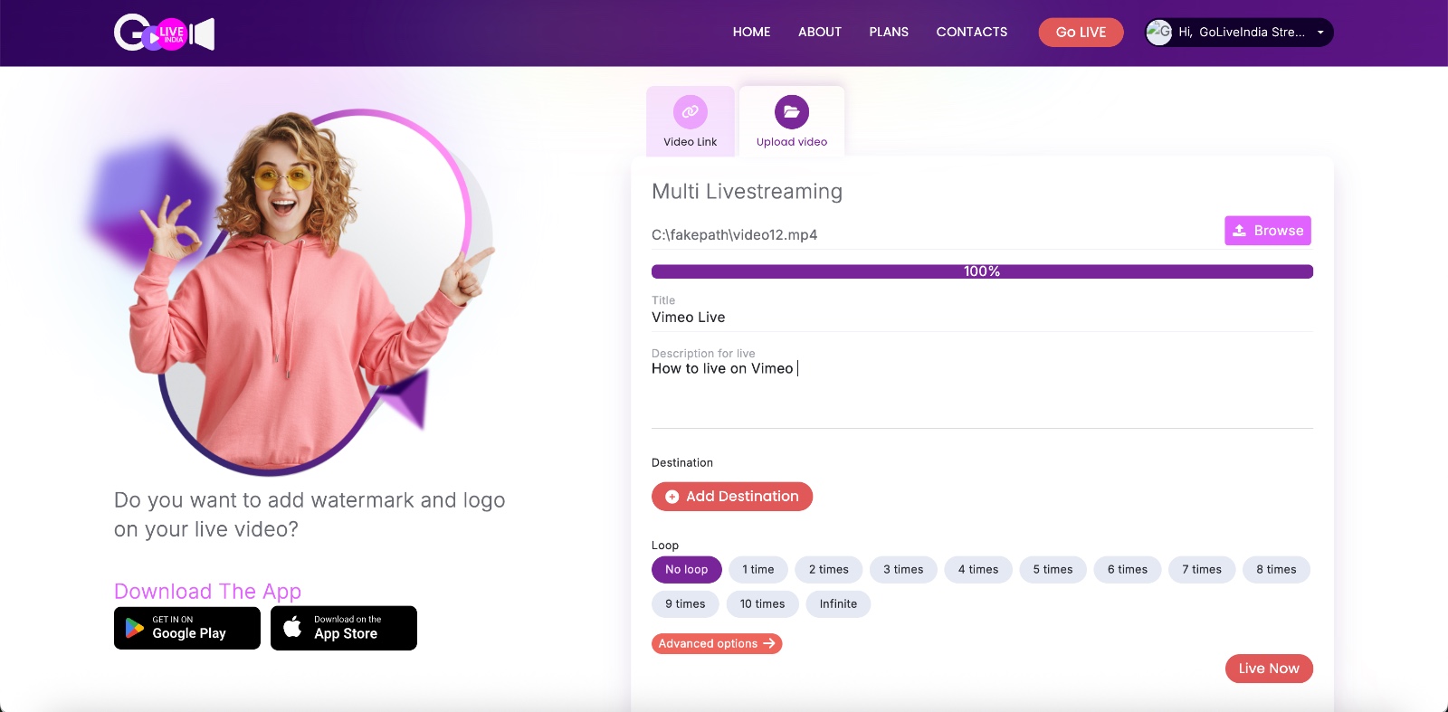 Yes. GoLiveIndia allows you to upload any video and stream it live on Vimeo.