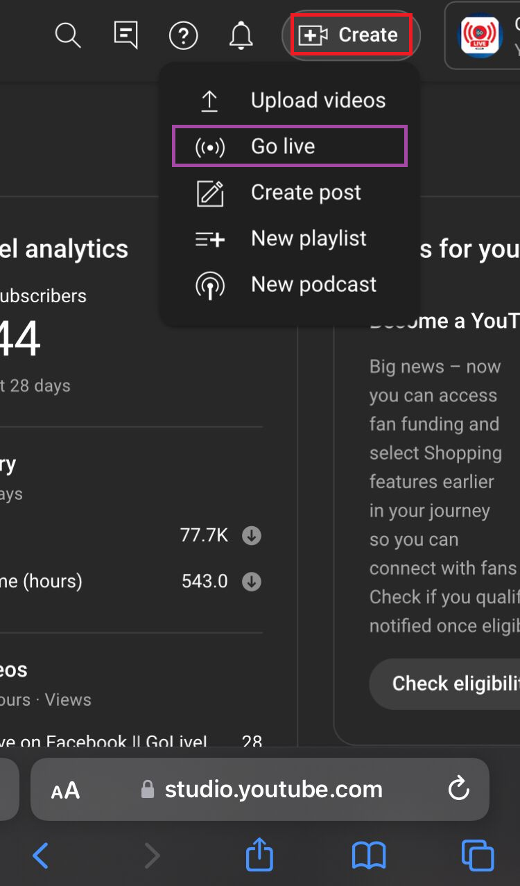 YouTube doesn’t offer full streaming options in the YouTube app, so here’s how to access the YouTube Live Dashboard using a mobile browser: