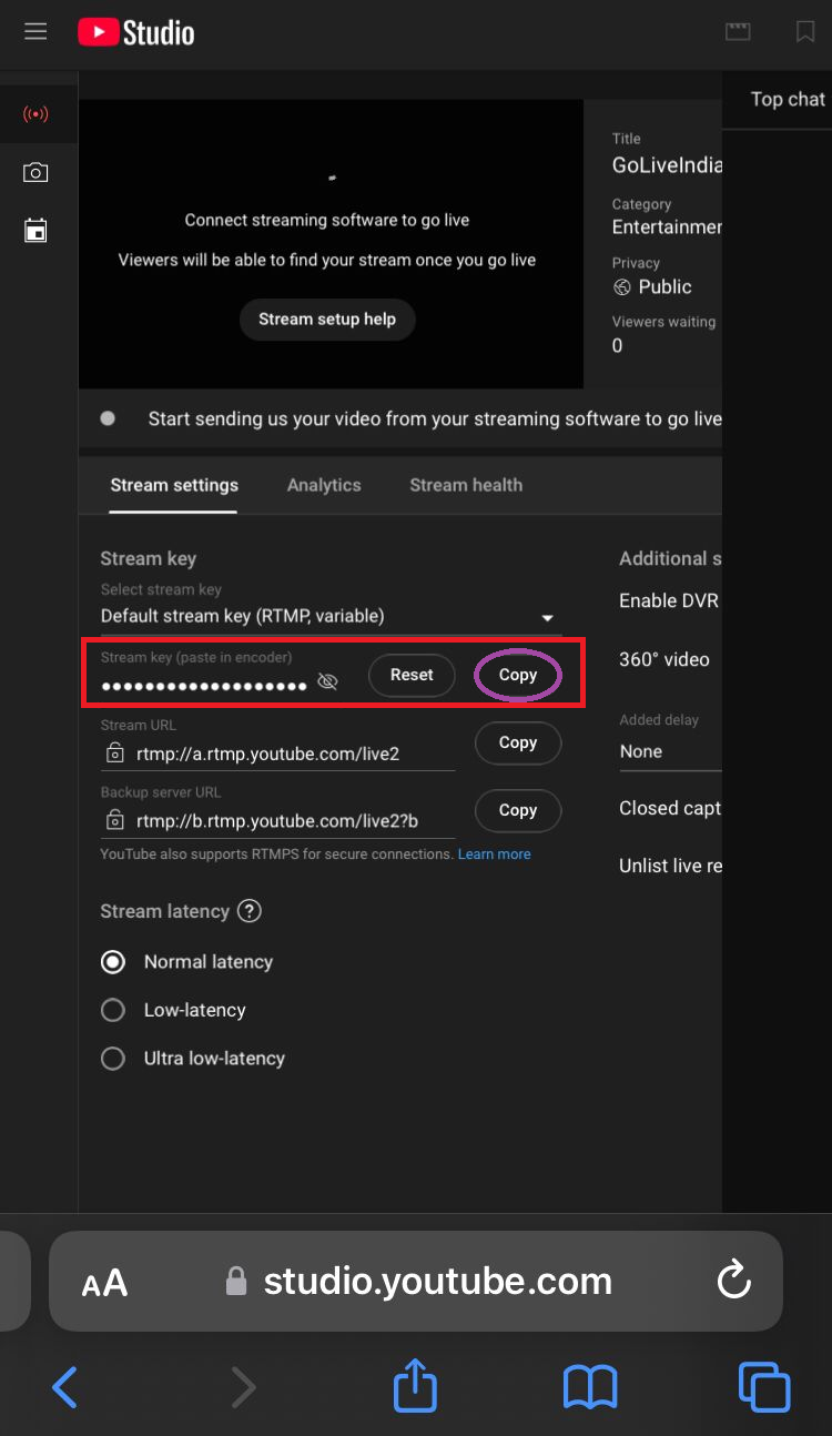 Whether you're on desktop or mobile, you need your YouTube Stream URL and Stream Key to go live via RTMP.
