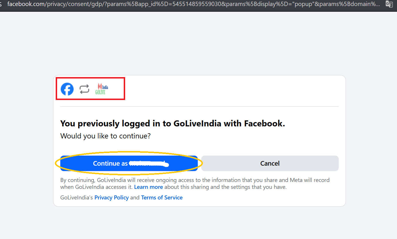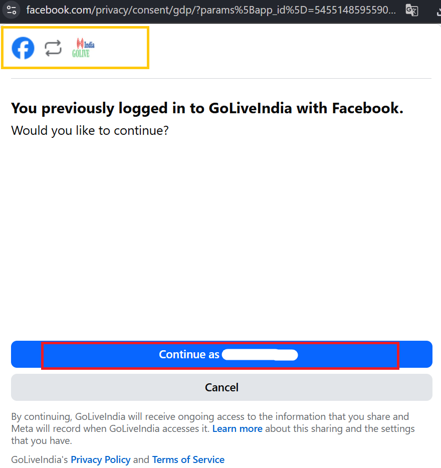 GoLiveIndia needs permission to access your Facebook profile so it can link your account for live streaming. You’ll see a prompt asking you to allow access.